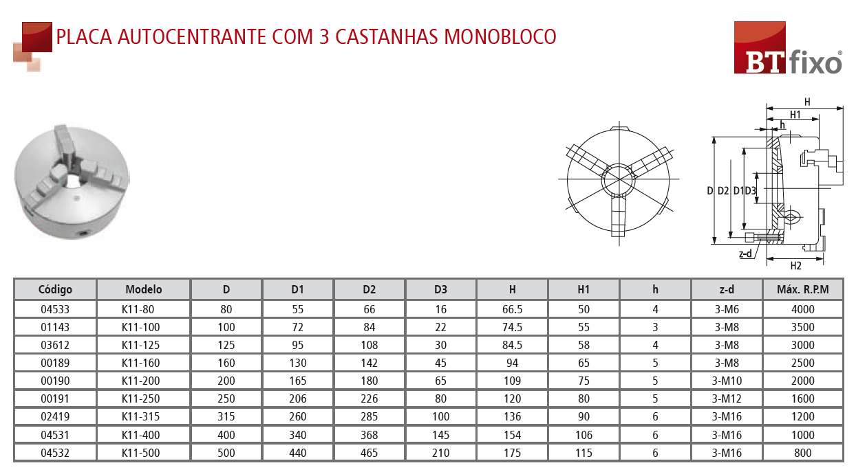 PLACA TORNO COM 3 CASTANHAS UNIVERSAIS - 250MM K11-250 (BTFIXO)
