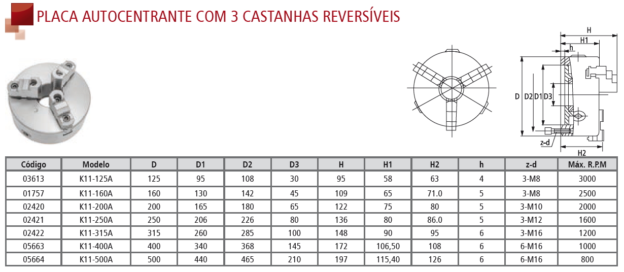 PLACA TORNO COM 3 CASTANHAS REVERSÍVEIS Ø 160MM K11-160A (BTFIXO)